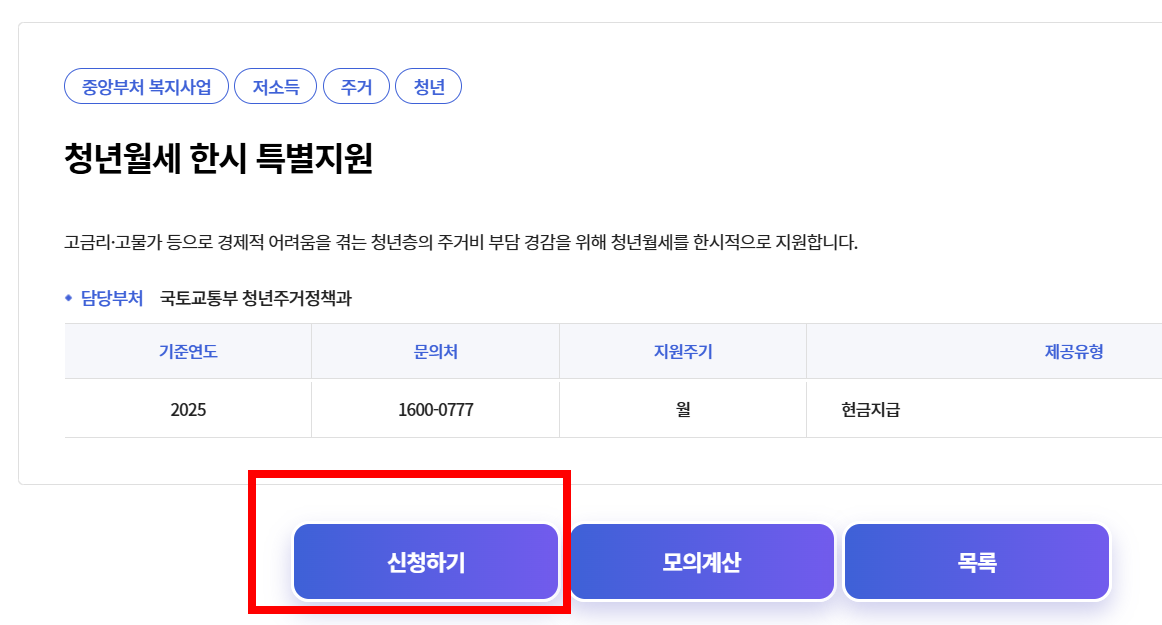- 복지로 - 메인화면 청년월세한시특별지원 검색 - 신청하기