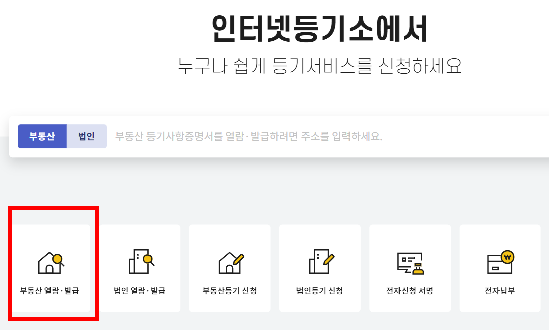 - '등기부등본 열람하기' 진입: 해당 메뉴에서 등기부등본 열람하기 항목을 선택하여 검색 페이지로 이동합니다.
