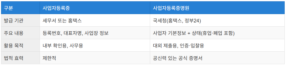 특히 은행, 공공기관, 인증심사 등에서는 단순 등록증 사본이 아닌 사업자등록증명원 발급본만 인정하는 경우가 많으므로, 이를 정확히 구분해 두는 것이 좋습니다.