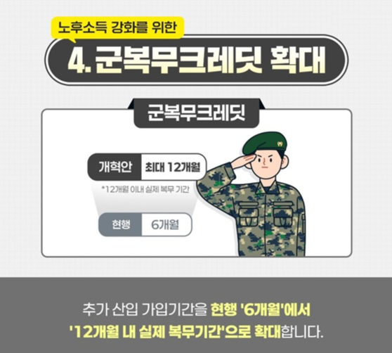 - 기존에는 군복무 추가 가입기간이 6개월로 제한되었으나, 실제 복무기간에 따라 최대 12개월까지 인정됩니다.