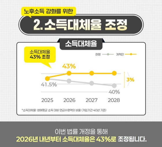 - 내년부터 소득대체율은 43%로 조정됩니다.
