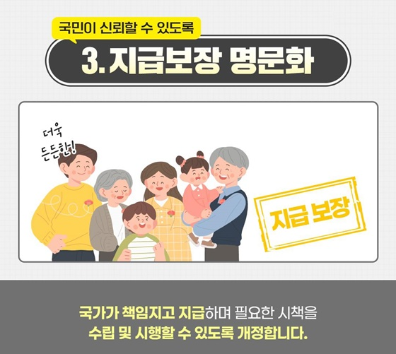 - 지급보장 명문화는 국민연금 수급자에게 제도 신뢰성 강화라는 중요한 의미를 갖습니다.
