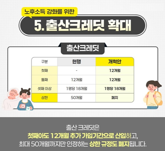 - 첫째 아이부터 12개월의 추가 가입기간을 인정하며, 최대 50개월 상한 규정은 폐지됩니다.
