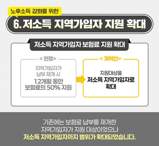 - 기존에는 연금료 납부를 재개한 지역가입자만 지원 대상이었으나, 이제 저소득 지역가입자까지 확대됩니다.